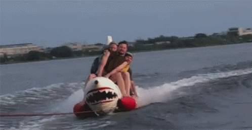 Three men have fun riding an inflatable shark banana boat on the water, pulled by a boat.