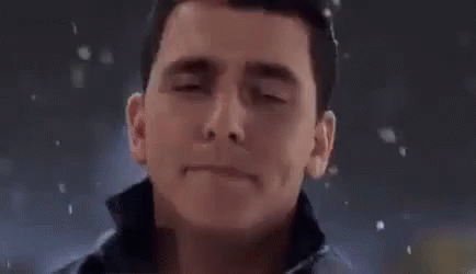Dutch singer Jan Smit sings and smiles joyfully while standing in falling snow.