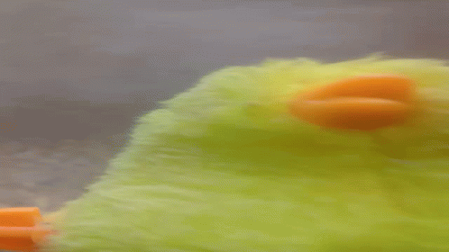 A green stuffed chick with an orange beak is held and moved, mimicking an evil laugh and pecking motion.