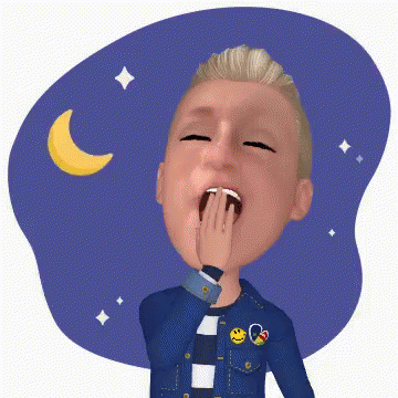An animated character yawns, covering his mouth, with a crescent moon and stars in the background.