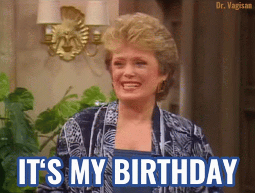 Blanche Devereaux from The Golden Girls joyfully exclaims, 'It's my birthday!' with a bright smile.