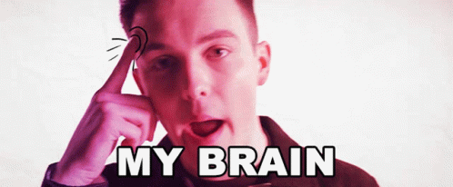 A man points to his forehead with the text 'MY BRAIN' displayed, symbolizing thoughts or mental activity.