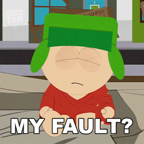 Kyle Broflovski from South Park, wearing his green hat, asks 'My fault?' with a concerned expression.