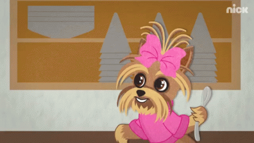 A cute cartoon Yorkshire Terrier with a pink bow declares 'MY FAVORITE!' next to a giant bowl of unusual dog food.