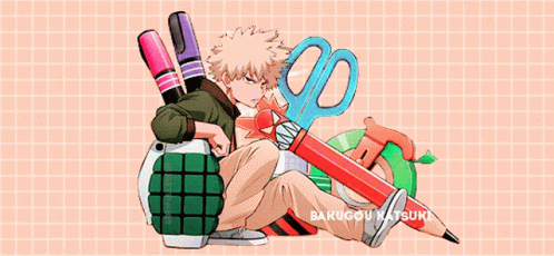 Katsuki Bakugo from My Hero Academia is depicted with oversized school supplies and a grenade.