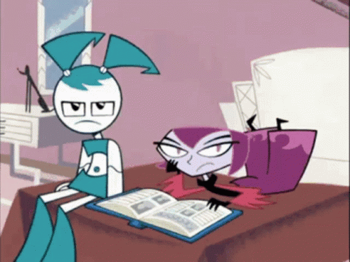 Jenny and Misty reading a book, followed by Brad and another character from My Life As Teenage Robot.