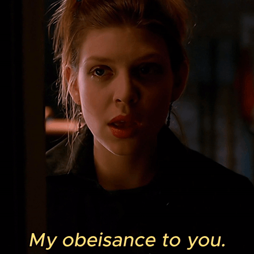 Amber Benson as Tara Maclay from Buffy the Vampire Slayer delivers the line 'My obeisance to you' with a serious expression.