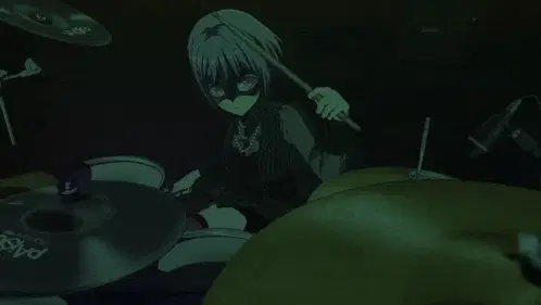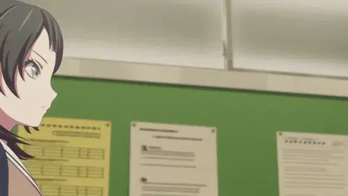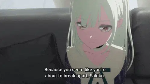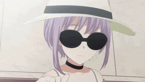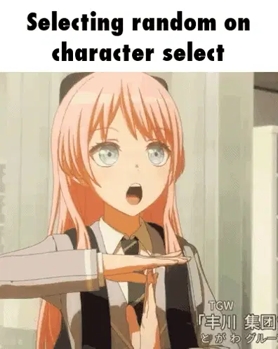 Chibi anime character Aine from MyGO!!!! with pink hair, suit, and tie, making an angry/confused face with 'Huh?' caption.