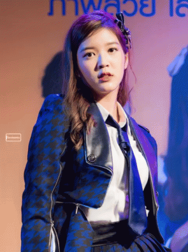 Myjunebnk48 Juju posing in a blue jacket and tie, with a hair accessory, on stage in Thailand.