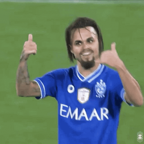 Michel Delgado, a soccer player, celebrates a goal or victory while wearing a blue Al-Hilal jersey with 'EMAAR' on it.