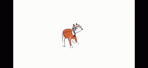 Animated dog character, Mysta Rias, wearing a coat and looking up, then standing.