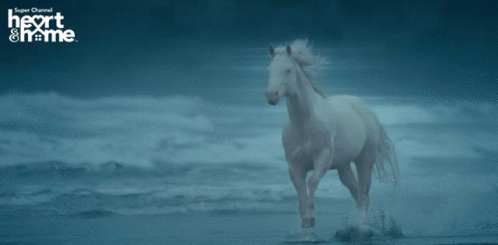 A majestic white horse gallops through the shallow water of a beach, creating splashes as it moves.
