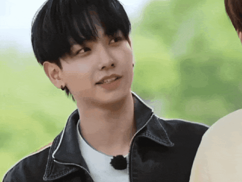 Myung Jaehyun from Boynextdoor smiles brightly, wearing a black jacket and white shirt outdoors.