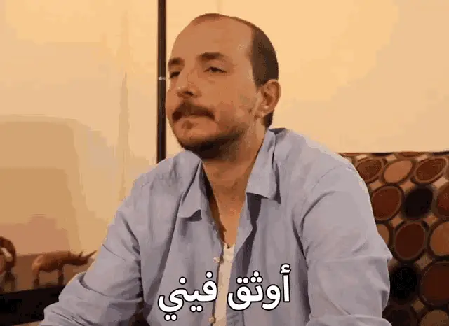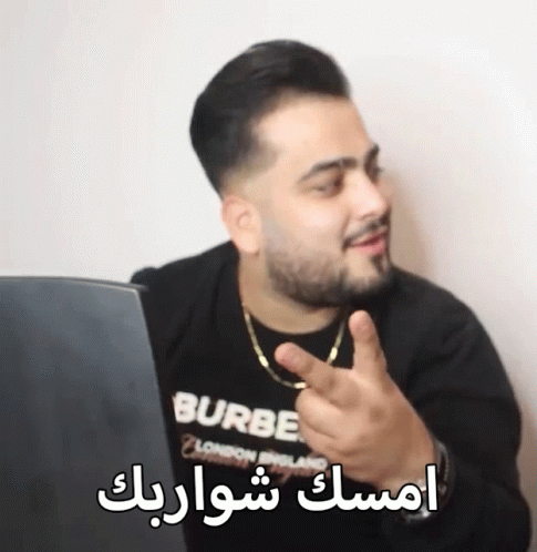 Mohamad Gowani playfully points and jokes, with the Arabic caption 'Hold your mustache' visible on screen.