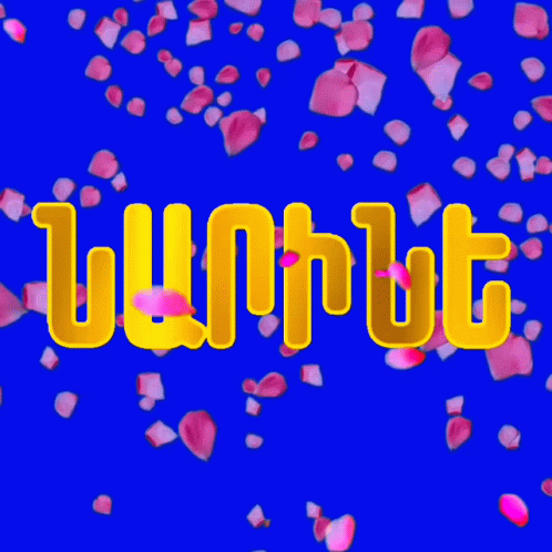 Yellow Armenian name 'Narine' on a blue background with falling pink petals.