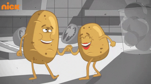 Two animated potatoes with faces and limbs happily dancing and holding hands in a cartoon kitchen scene.