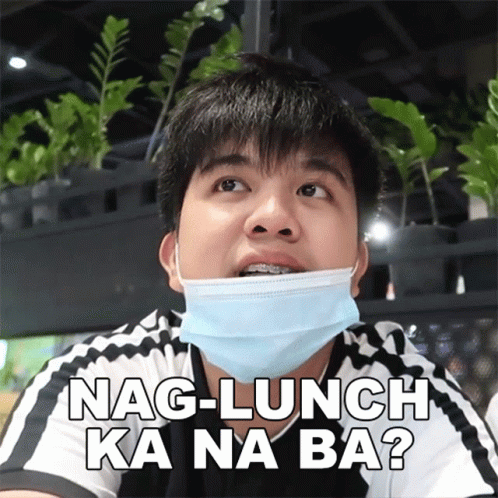 Junell Dominic asks 'Nag-Lunch Ka Na Ba?' (Have you had lunch yet?) with an expressive face, wearing a mask.