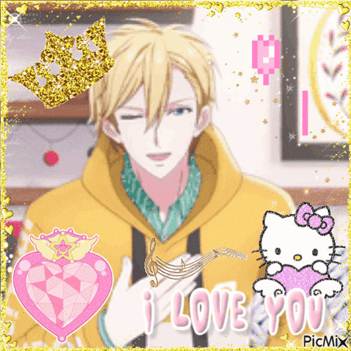 Nagi Rokuya from Idolish7 expresses love with Hello Kitty, surrounded by sparkling effects and a magical heart.