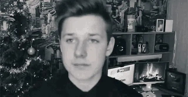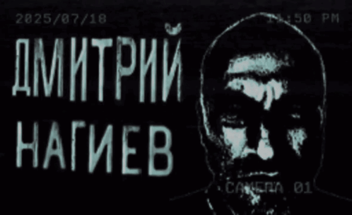 A grainy, black and white surveillance-style image of Dmitry Nagiev with a date and camera label, evoking a horror theme.