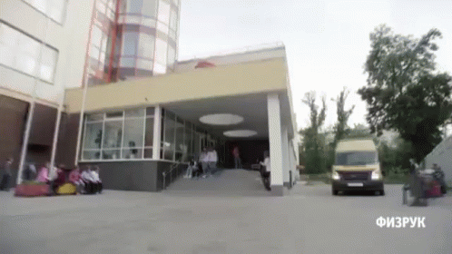 Dmitry Nagiev as Fizruk exits a cool yellow van in a scene from the popular Russian series.