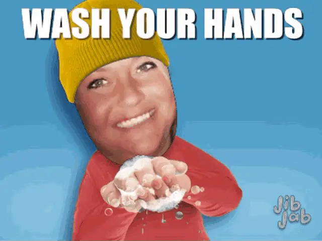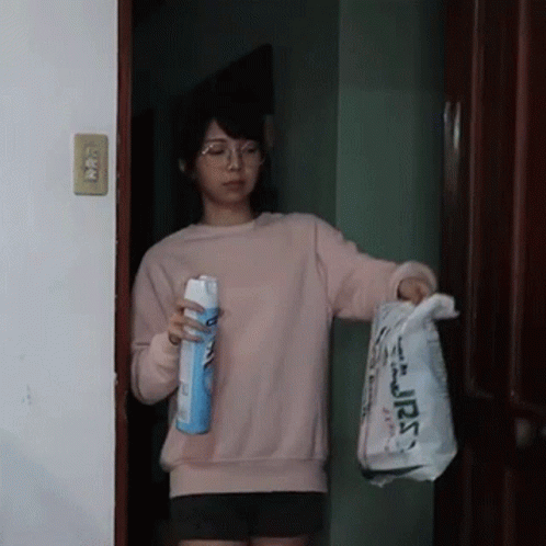 Kitz Cua holds a spray bottle and a package, preparing to disinfect it.
