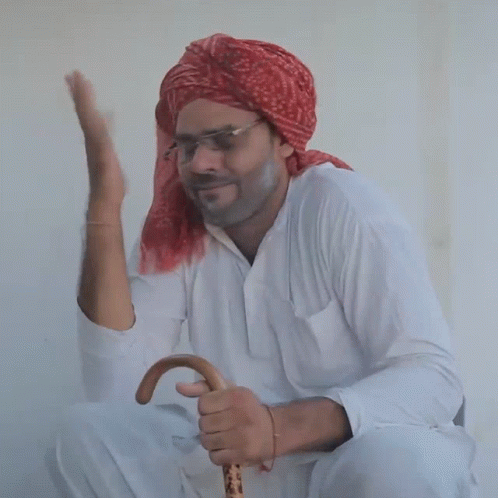 Balraj, a man in a red turban, emphatically gestures 'no' with his hand and head, expressing disagreement.