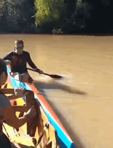 Nahuel Crha experiences a kayak fail on a muddy river, nearly falling out of his blue kayak.
