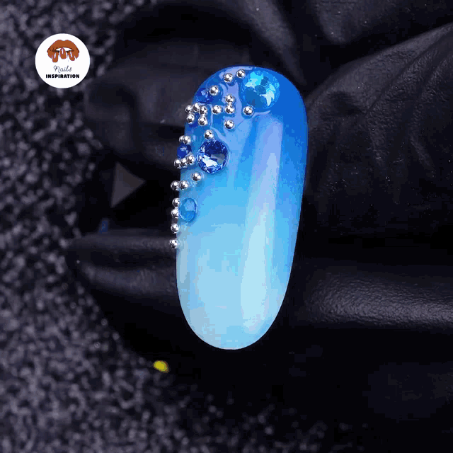 Close-up of a beautiful blue ombre nail art design adorned with sparkling blue rhinestones and silver beads.