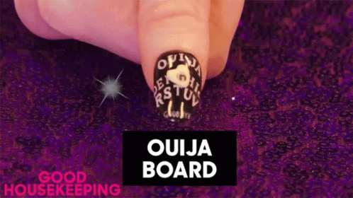 Close-up of a fingernail featuring detailed Ouija Board nail art with letters and a planchette.