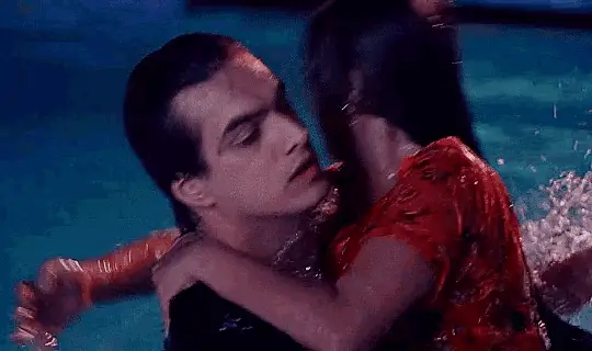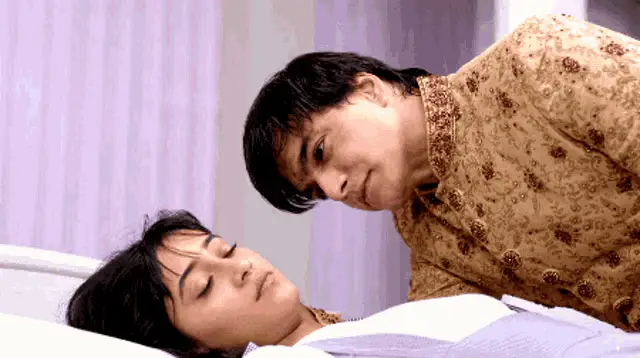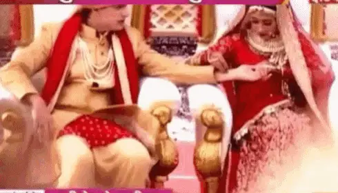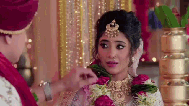 Naira, the bride, participates in a wedding ritual as Kartik applies sindoor to her forehead during their ceremony.