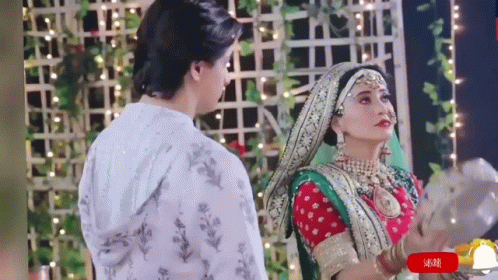Naira performs the Karwa Chauth ritual, looking at her husband through a sieve in traditional attire.