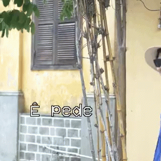 Nala Thien Phu Khang Le and Ma Nguyen in hats, with 'É pede' caption, in front of a yellow building.