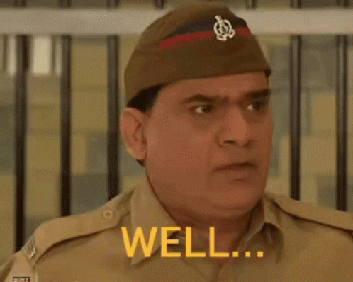 Naman73, portraying Gopi in a police uniform, reacts with a resigned 'Well...' expression.