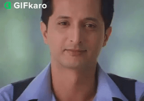 A man in a blue shirt greets with 'Namaste', making a funny face and smiling.