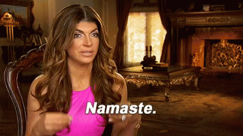Teresa Giudice performs a Namaste gesture while speaking, wearing a pink top in a living room setting.