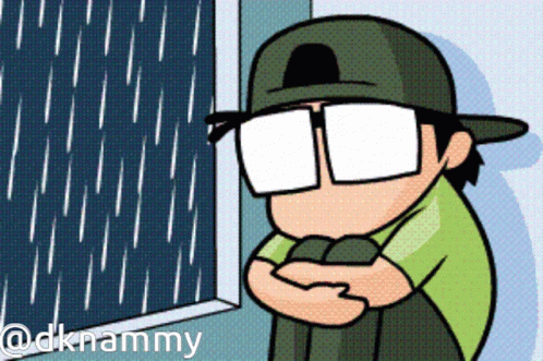 Nammy, a cartoon character with glasses and a baseball cap, sits sadly looking out a window at the pouring rain.