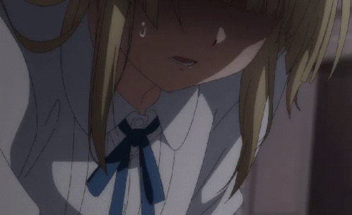 Amaki Sally from Nanabun No Nijuuni in a distressed and emotional moment, wearing a white shirt and blue bow.