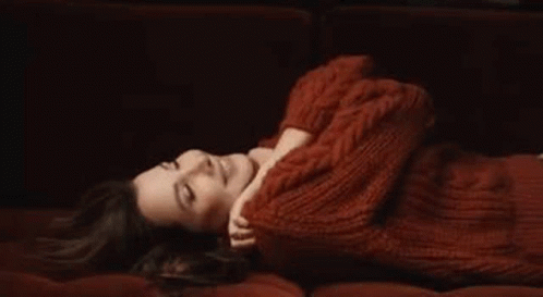 Nancy Ajram relaxing on a red couch, wearing a cozy red cable-knit sweater and smiling.