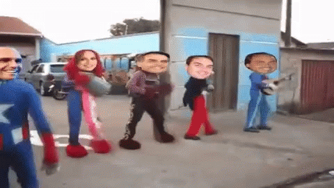 Jair Bolsonaro, Nando Moura, and others with superimposed faces dance in superhero costumes on a street.