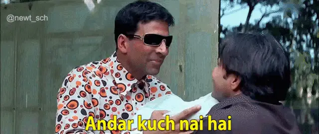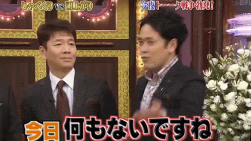 Two men in suits on a Japanese talk show, one gesturing while a caption reads "Nothing today, is there?".
