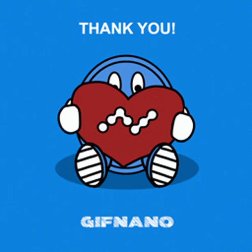 A cute blue Nano character holding a red heart with a wavy line, expressing gratitude with 'THANK YOU!' and 'GIFNANO'.
