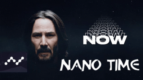 A man with long hair and a beard next to animated 'NOW' and 'NANO TIME' text, promoting Nanocurrency.