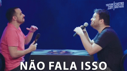 One of the Castro Brothers reacts humorously to the other, covering his mouth and laughing while being told 'Não Fala Isso'.