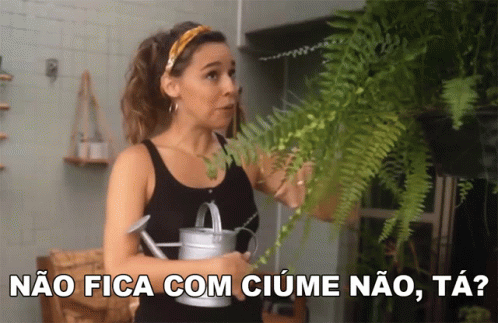 Thati Lopes, holding a watering can, tells someone "Don't be jealous, okay?" next to a fern plant.