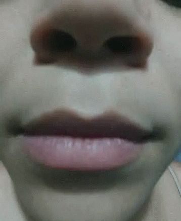Close-up of a person's face, focusing on the nose and pink lips, with subtle mouth movements.