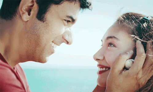 Engin Akyürek and Neslihan Atagül share a tender, smiling moment by the sea, with Engin kissing Neslihan's forehead.