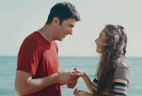 Engin Akyürek as Sancar Efeoglu kisses Neslihan Atagül's hand as Nare Çelebi in a romantic beach scene from Sefirin Kizi.