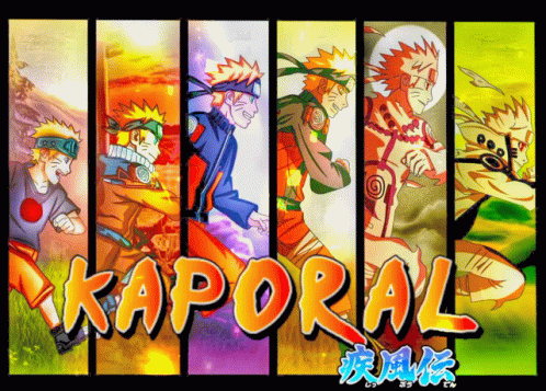 Dynamic collage showcasing Naruto's evolution through different forms, featuring the prominent 'Kaporal' branding.