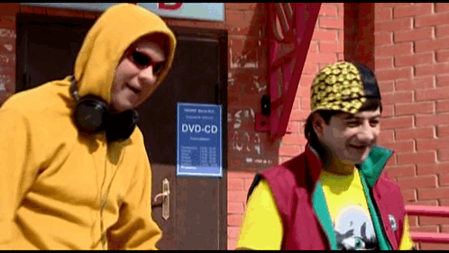 Slavik and another man from Nasha Russia discuss being scared, with one wearing a yellow hoodie and headphones.
