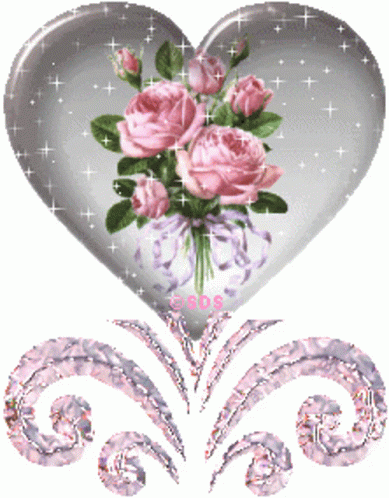 A sparkling heart with a bouquet of pink roses on it, surrounded by glittering swirls, featuring Nasserq.
